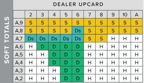 - 17 (A, 6): double if the dealer has 3-6, otherwise draw.